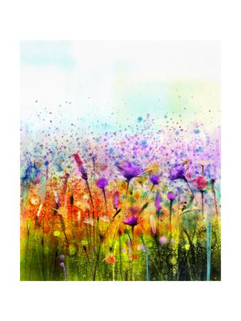 Abstract Watercolor Painting Purple Cosmos Flower Cornflower