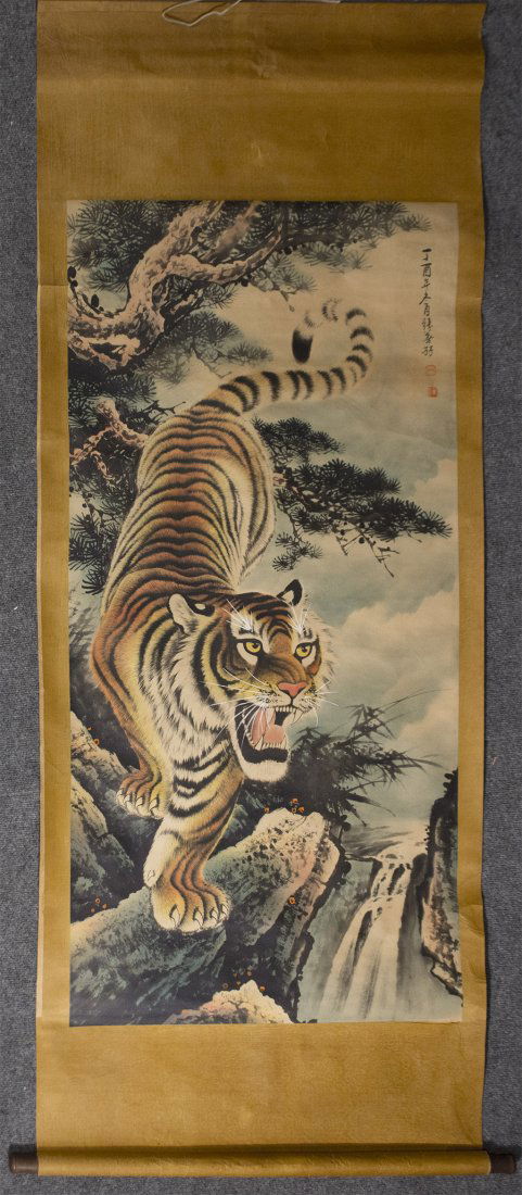Chinese Tiger Painting Rice Paper Scroll Antique Sep 21 2019
