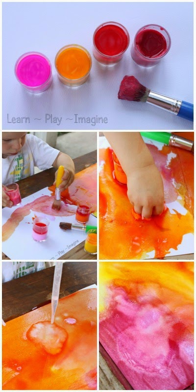 Next youll want to mix your paint with baking soda or vinegar. Add a little bit of water and washable liquid watercolors until you get a mixture that is paintable. Take your dropper and drip vinegar over your painting. We ended up with vivid paintings and had a great time creating.