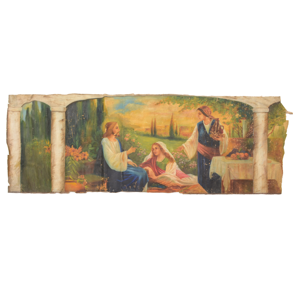 Lg Antique Religious Painting Canvas Mural Jesus Fam Angel