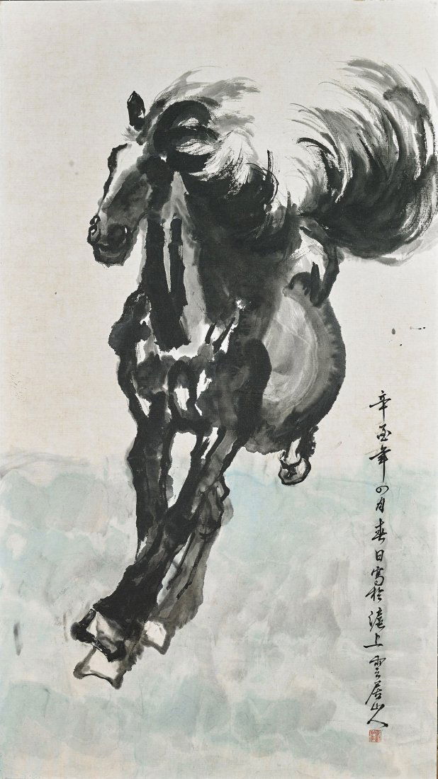 Two Running Horses Oriental Ink Painting With Chinese Hieroglyph