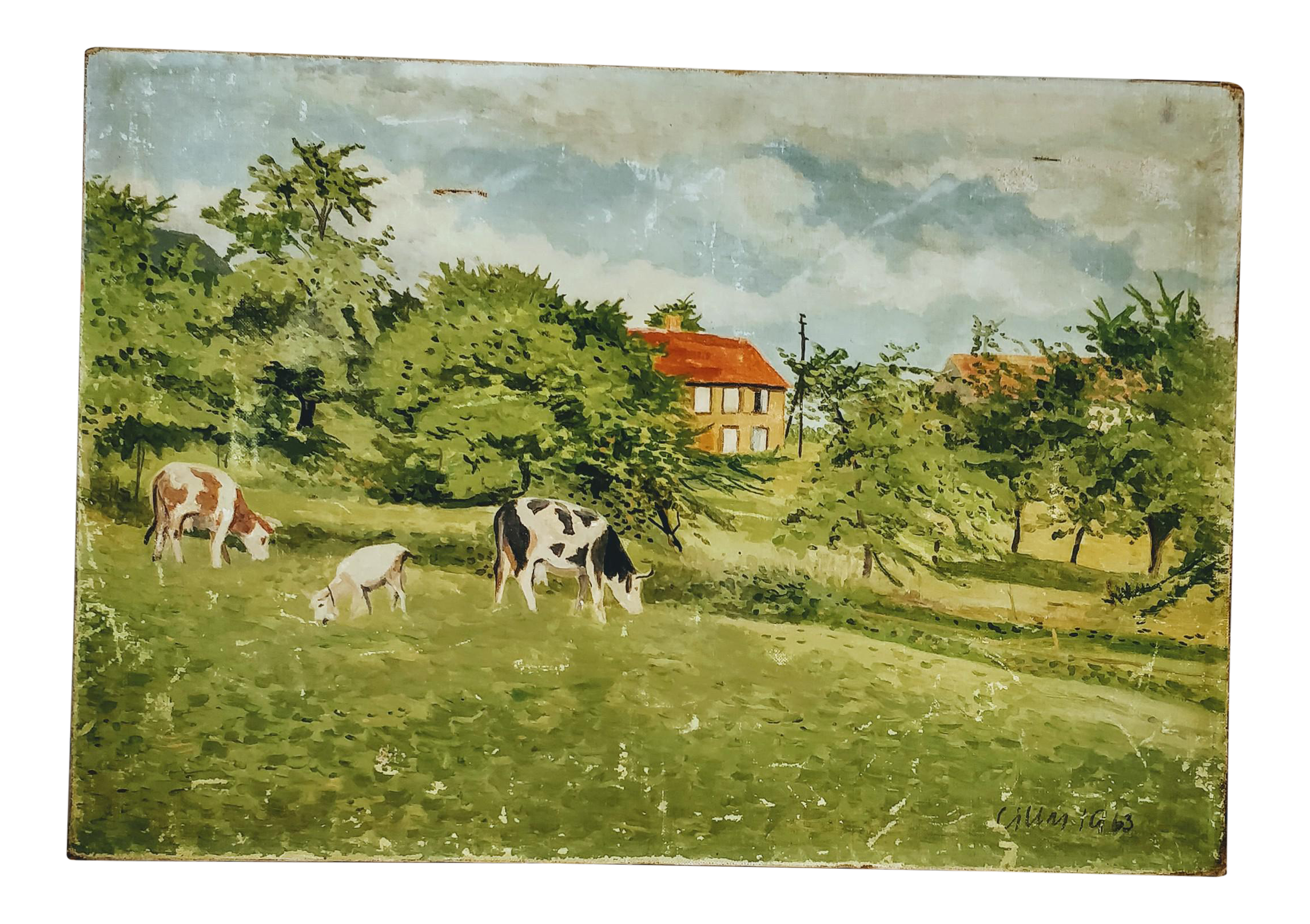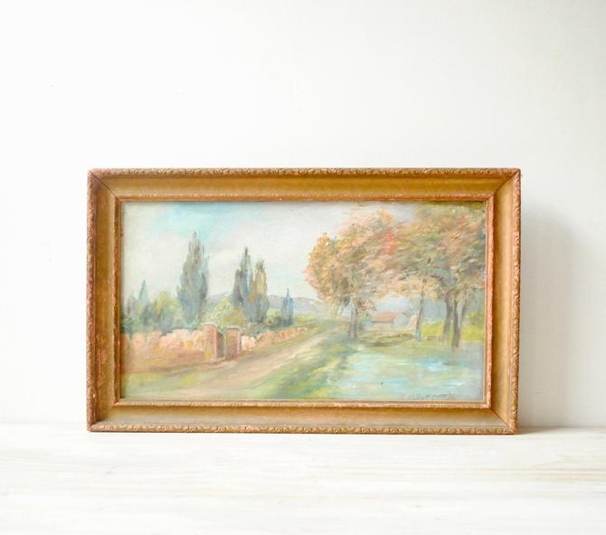 Very Large French Vintage Landscape Painting Of Countryside Scene