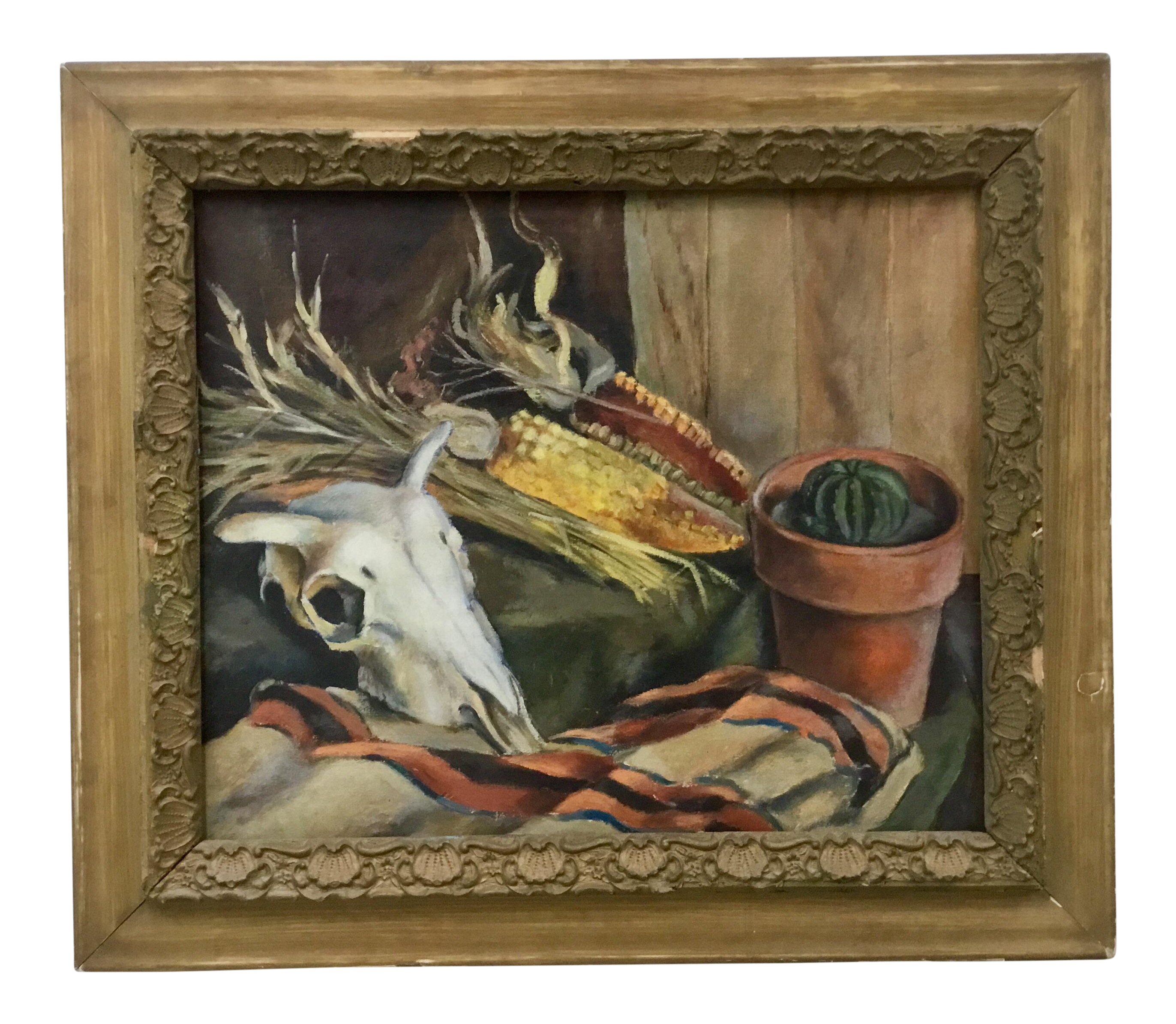 Mid Century Southwestern Still Life Oil Painting Cow Skull Signed