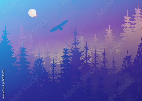 Winter Watercolor Landscape Night Sky Sunset And Forest Abstract