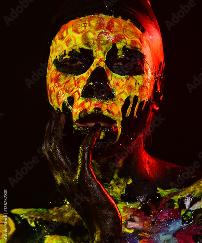 Closeup Of Man With Face Paint Against Black Background High Res