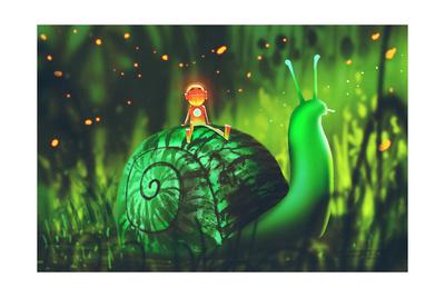 Green Snail With Cute Robot Sits On Its Back Against Night Forest