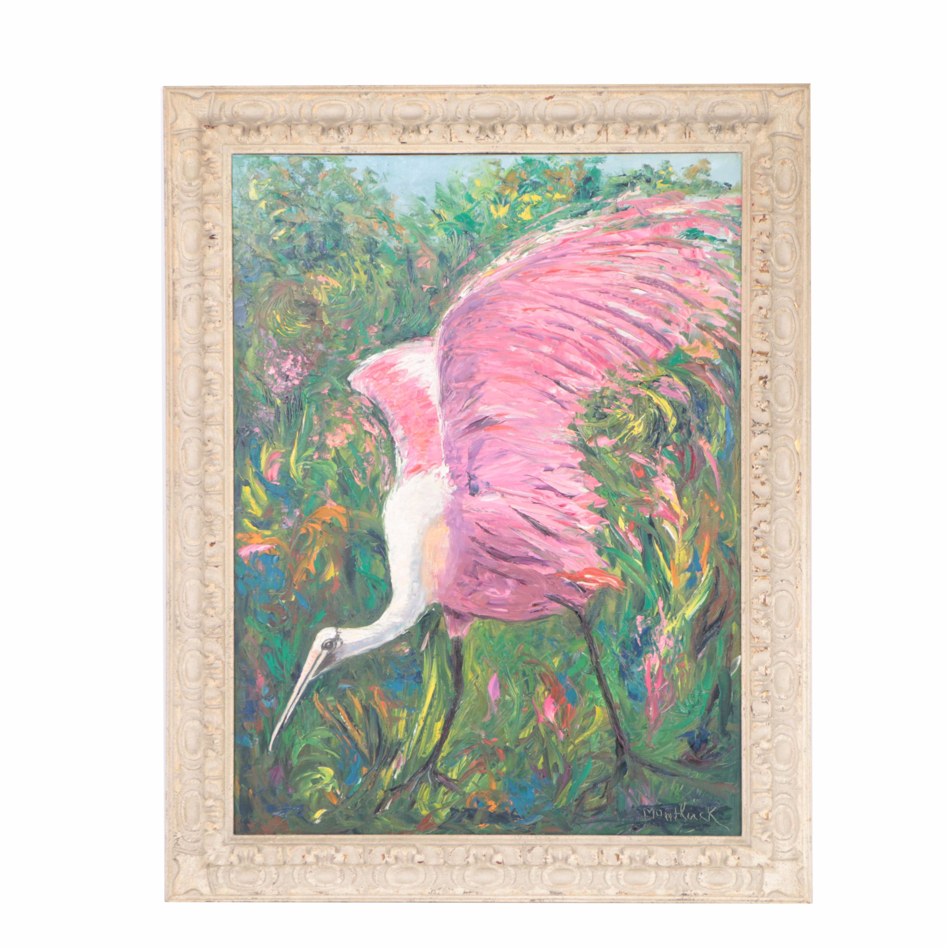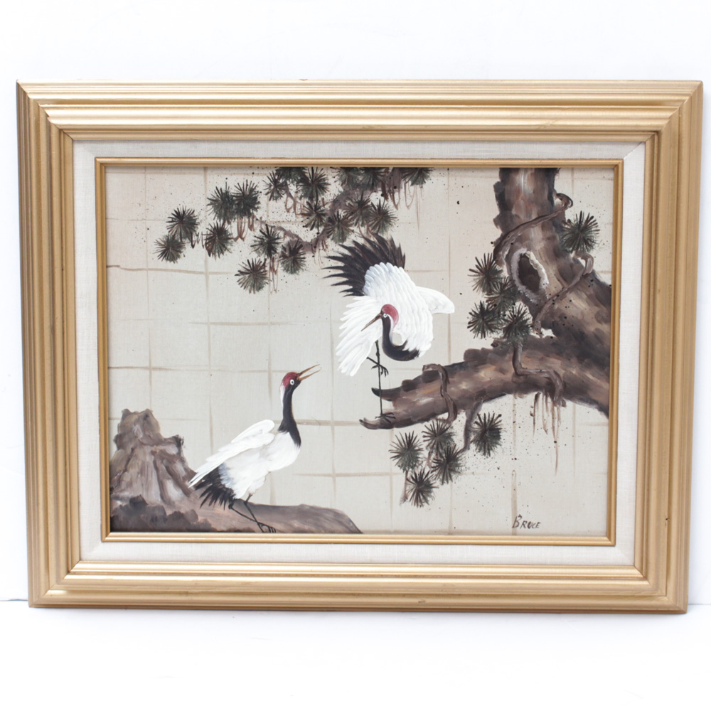 Signed Oil On Canvas Chinese Crane Bird Painting Choi Midcentury