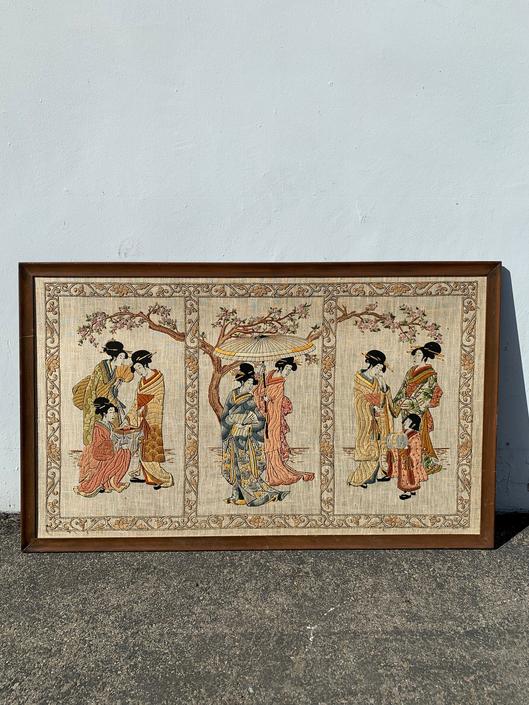 Antique Needlepoint Framed Wall Art Pat Zitomer Hand Stitched Textile Crewel Embroidery Hand Sewn Asian Japanese Design Oriental Ukoyo E By Dejavudecors From Deja Vu Decors Of Los Angeles Ca Attic