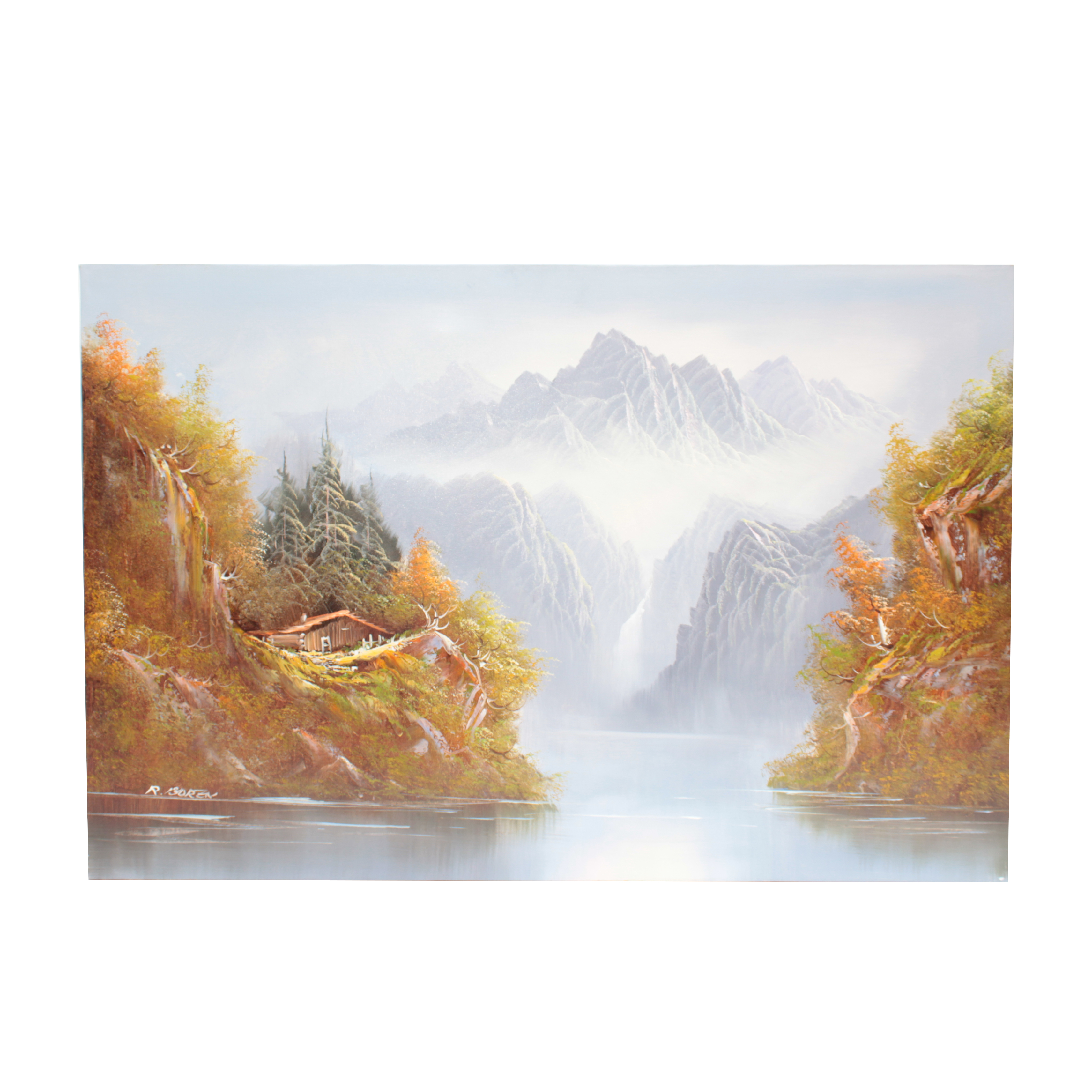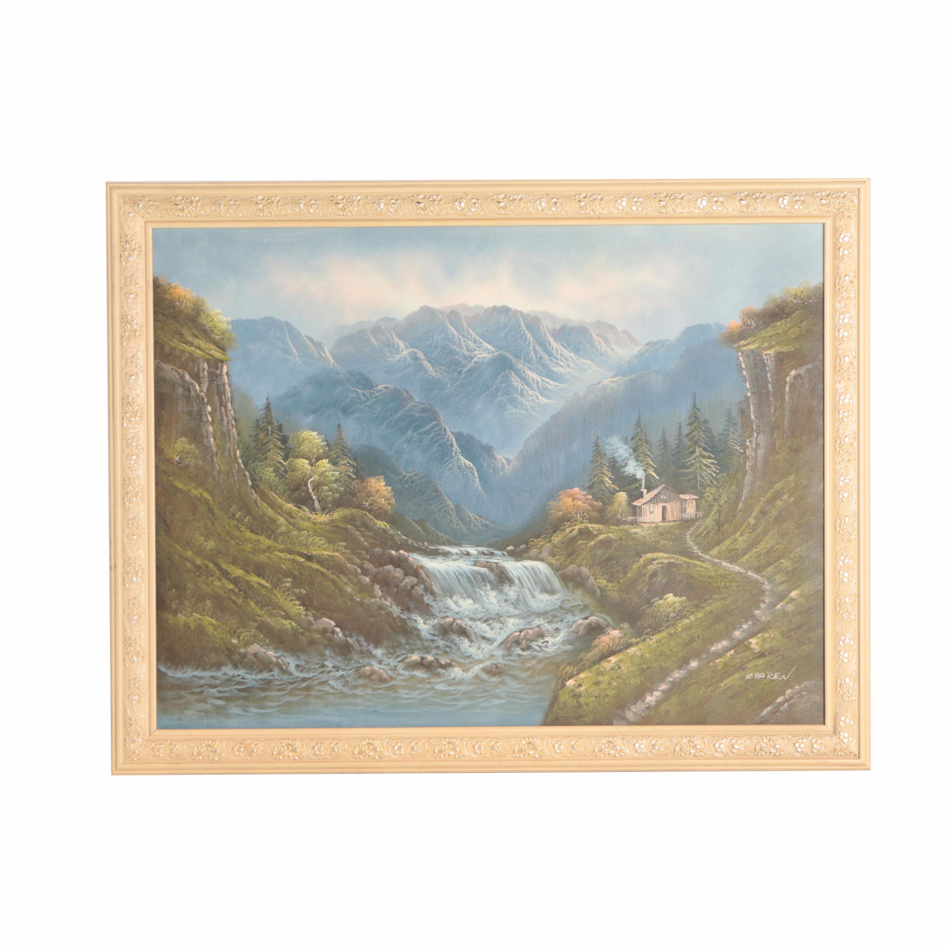 R Boren Original Oil On Canvas Cabin Waterfall Landscape Painting