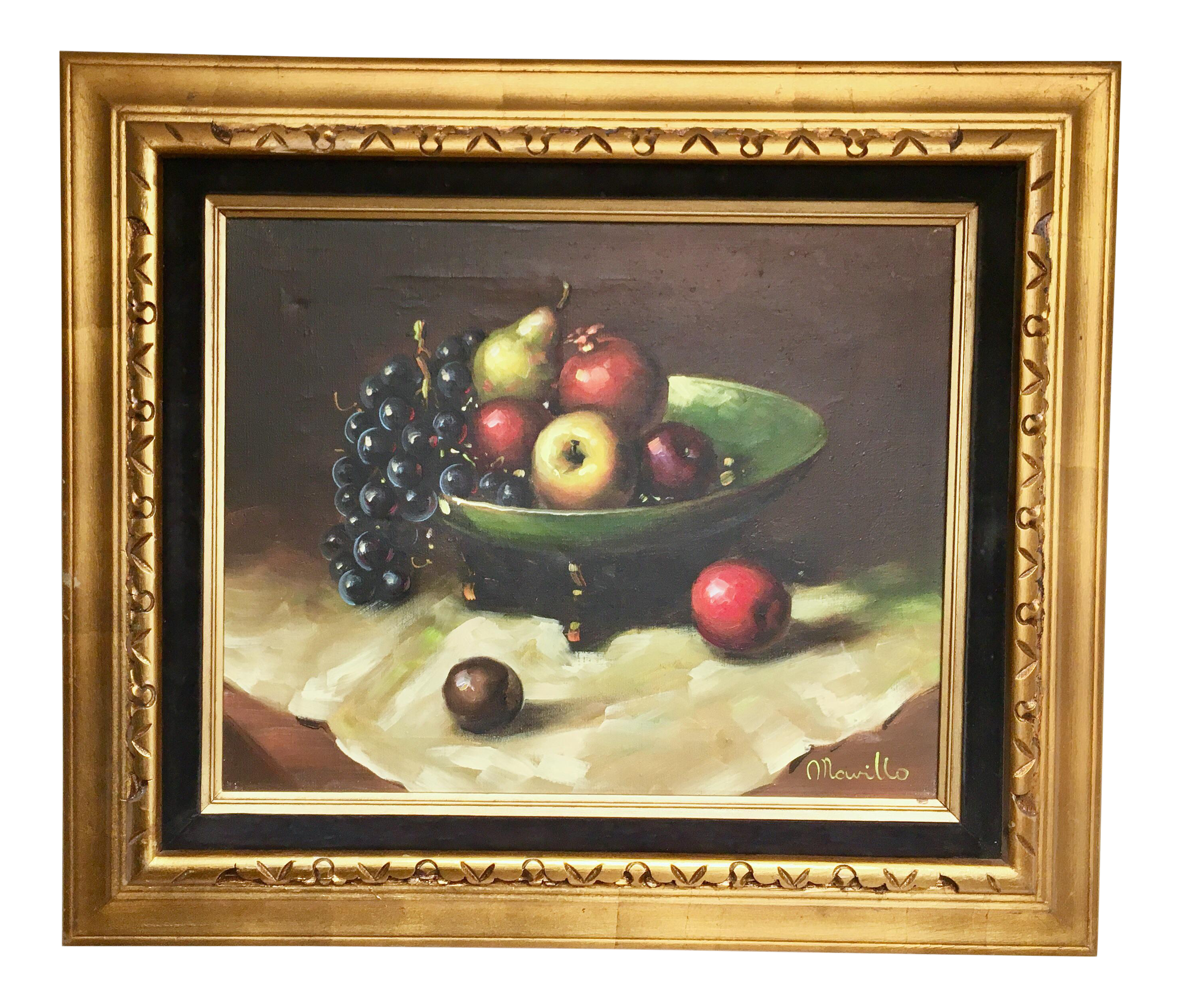 Basket of fruit c1599 is a still life painting by the italian baroque master michelangelo merisi da caravaggio 15711610 which hangs in the biblioteca ambrosiana ambrosian library milan. The basket contains a selection of summer fruit. A good sized light red peach attached to a stem with wormholes in the leaf resembling. Still life painting of a fruit bowl with grapes pineapples and apples by eva mcmurrey a texas artist circa 1954.