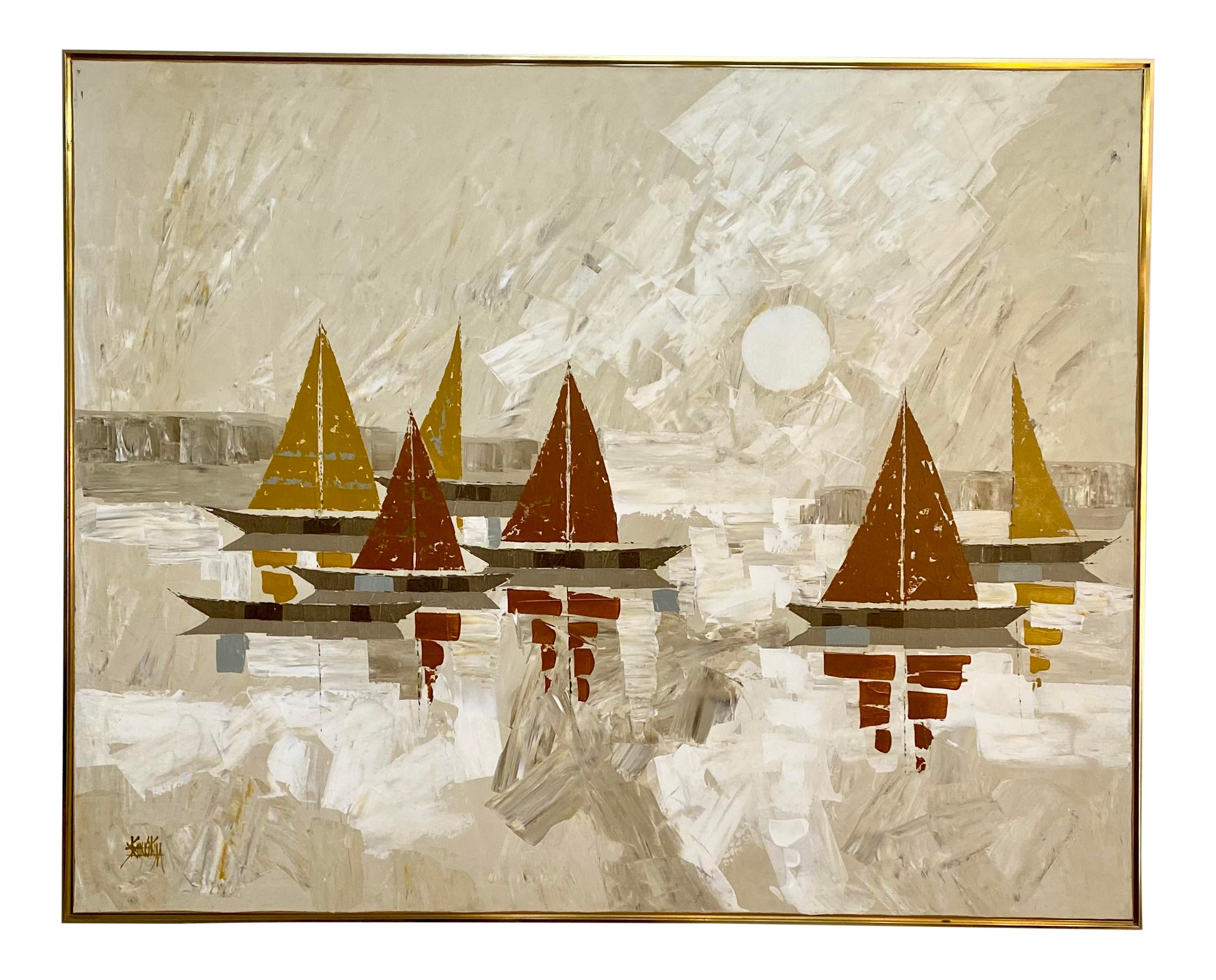 Original Oil Painting Of Boats And Sea On Canvas Sunset Over Stock
