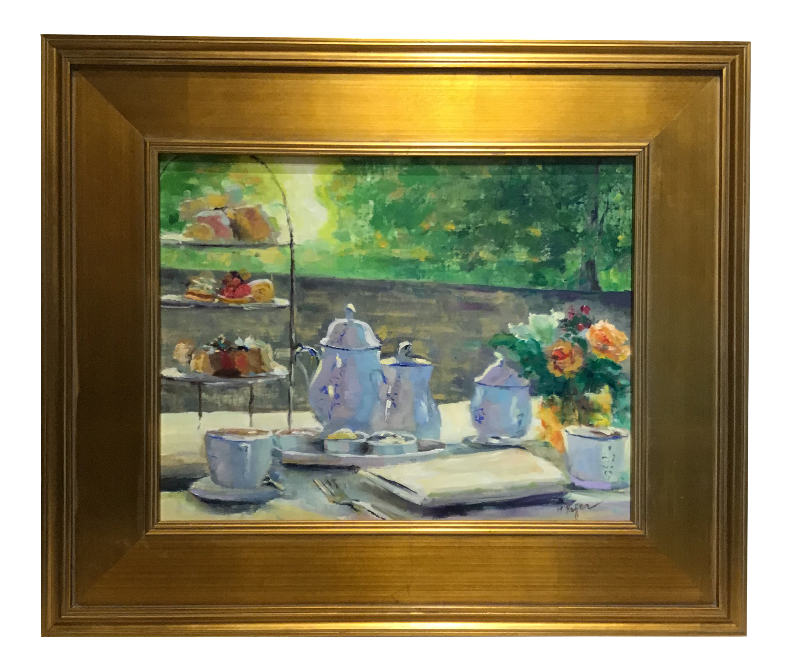 Vintage French Naive Folk Art Oil Painting Tea Time Garden Women