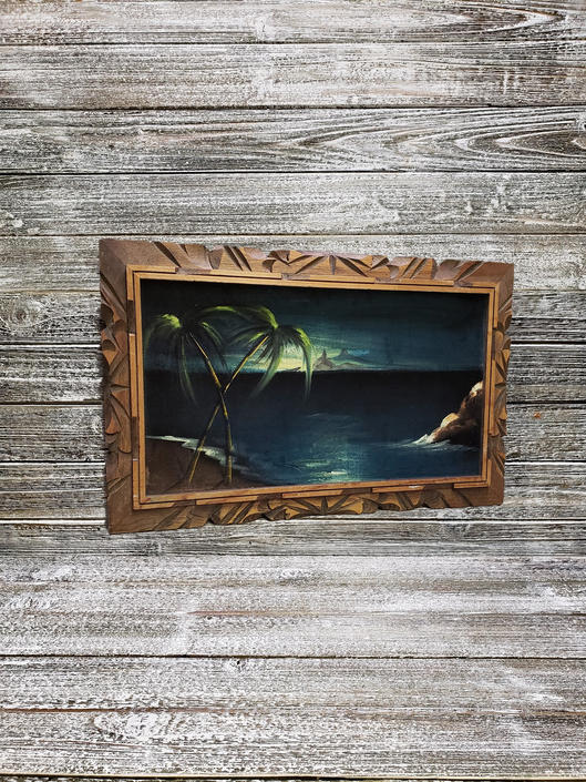 Large Vintage Black Velvet Painting Of Hawaiian Landscape In Gold